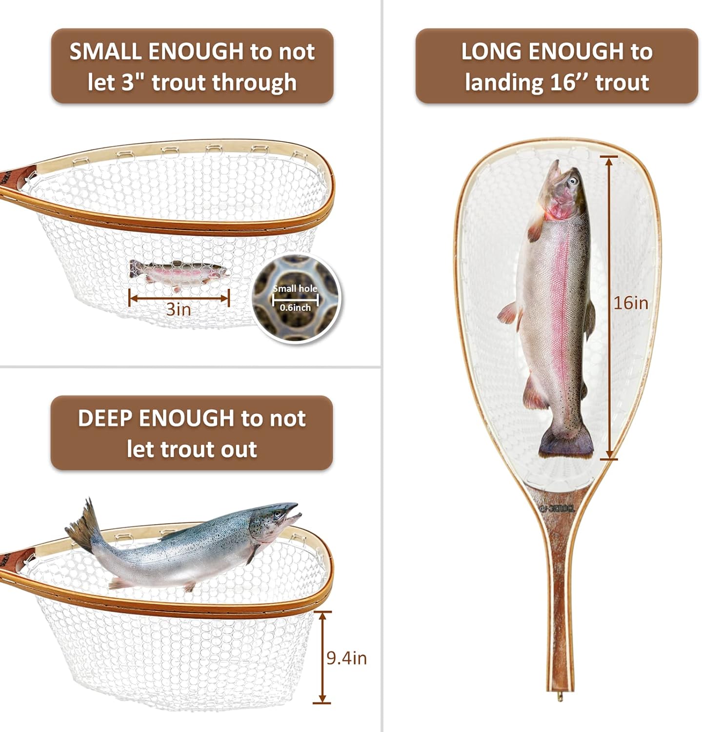Fly Fishing Net Trout Net with Magnetic Release and Rod Holder Wooden Frame Landing Net with Soft Rubber Mesh for Catch and Release (Clear Small Holes)